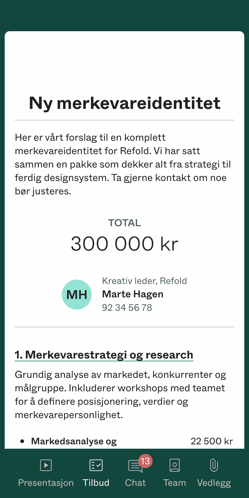 Sett sammen tilbudet med gjenbrukbare maler for nettside, branding, kampanjer og andre tjenester. Strukturer prosjektet i faser, legg til timer og faste priser, og presenter det profesjonelt — på mobil og desktop.